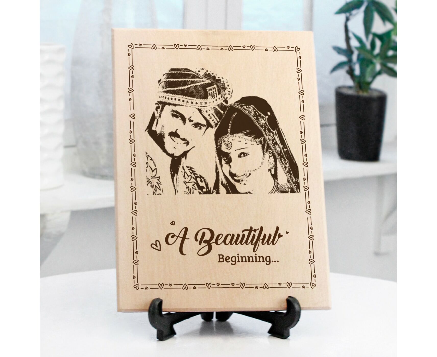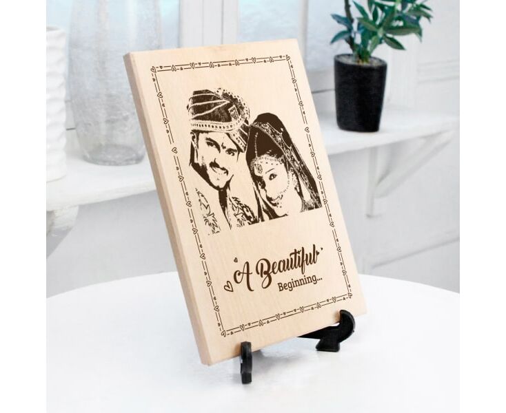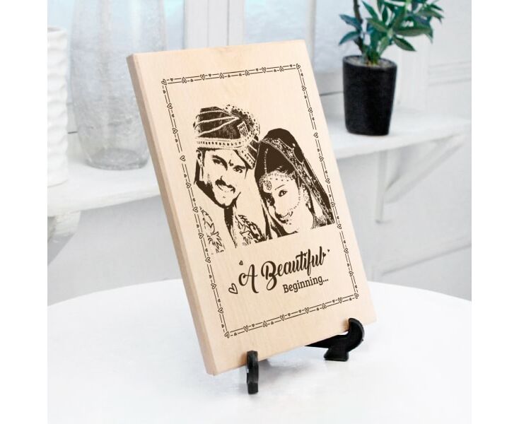 Here's a personalized wooden photo frame that freezes the most special moment of life- the wedding day. The wooden photo frame with the stand can be personalized with the desired image of the couples, the perfect gift for your dear ones starting the new journey.