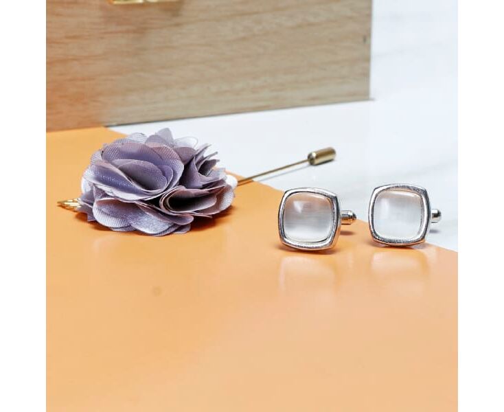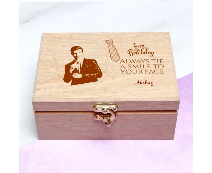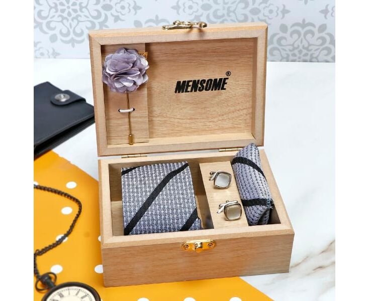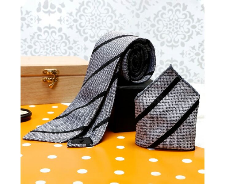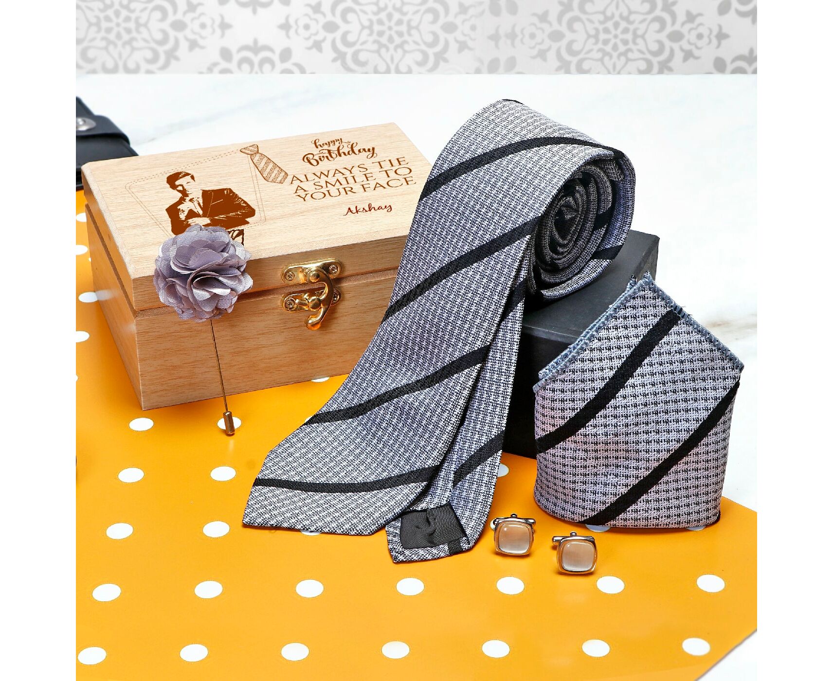 This Grey Striped Necktie Set is made for a refined man, the star of any event or party. The set includes a Tie, a Pocket Square, Cufflinks and a Lapel Pin. Comes in a Birthday special Wooden Box and you can engrave a name on it, hence, it makes for the perfect gift for the occasion.